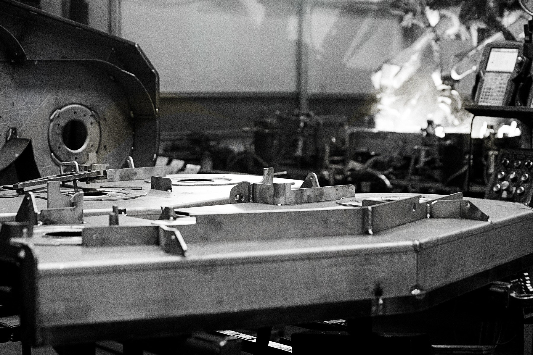 Stamped steel cutting decks are produced by pressing, or stamping, a flat sheet of steel into shape. The stamping process introduces limitations to the thickness and ductility/malleability of the material used. As a result, stamped cutting decks will often use thinner 12- or 13-gauge steel, compared to 7- to 10-gauge steel Exmark uses to produce its fabricated cutting decks.