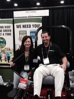 Project EverGreen Executive Director Cindy Code with Great Mower Giveaway Raffle winner Joe Kucik in the Project EverGreen booth at GIE + EXPO 2015.